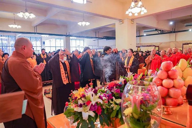 下午2:30,般若楼内善信云集。在声声佛号中,水陆法会内斋主众姓人等在悦众师父们带领下,严整威仪,上至法堂,迎请和尚。