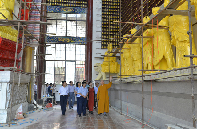 图1 正觉寺万佛大雄宝殿,仁炟法师介绍寺院建设情况。