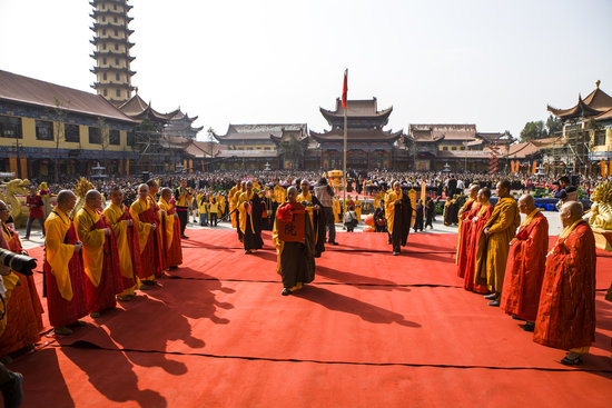当天上午9时许,升座法会正式举行,僧俗两众数千人在山门迎请仁炟法师。仁炟法师入寺后,依序登上钟楼、鼓楼,敲响了钟声、鼓声。