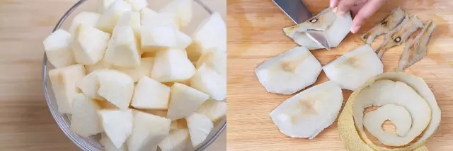 ①梨洗干净刨皮去核,切成小块。小块更容易变软煮烂,梨越多熬出的雪梨膏越厚实。
