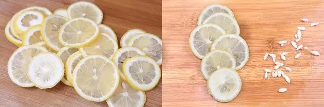 ②柠檬洗净外皮,清水浸泡片刻,用盐在柠檬的表面搓洗,可以清除残留的蜡和农药。洗净后连皮切成薄片,薄片出汁快,比较入味。记得一定要去籽,柠檬籽超级苦而且不容易煮烂。