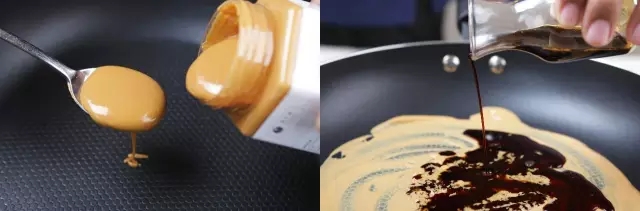 ⑥选择细腻原味的花生酱,加入少量生抽,小火烘香花生酱