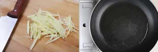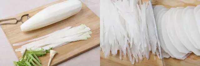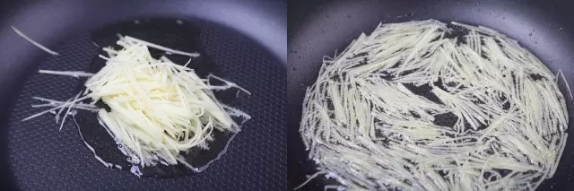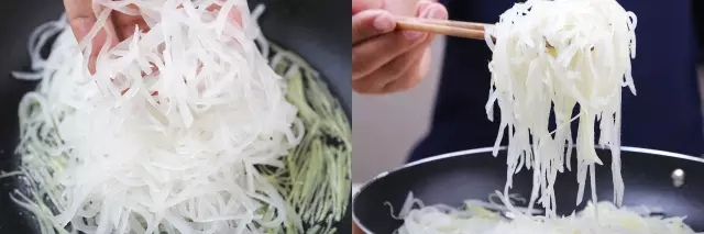 ⑤出水的萝卜丝挤干水分,热锅加入萝卜丝,小火炒熟,保持脆嫩的口感。盛起备用