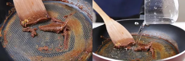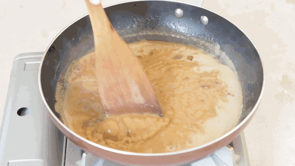 ⑦加入等量的水,熬煮花生酱汁。顺着一个方向搅拌片刻,口感更加丝滑。