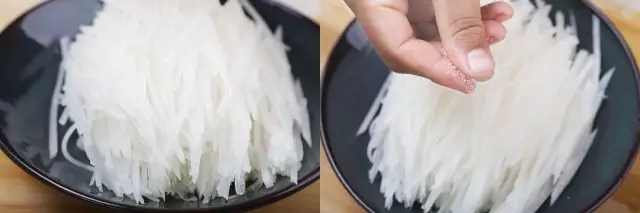 ②切好的萝卜丝放入盘中,用盐腌制5-10分钟左右让萝卜出水口感更加爽脆