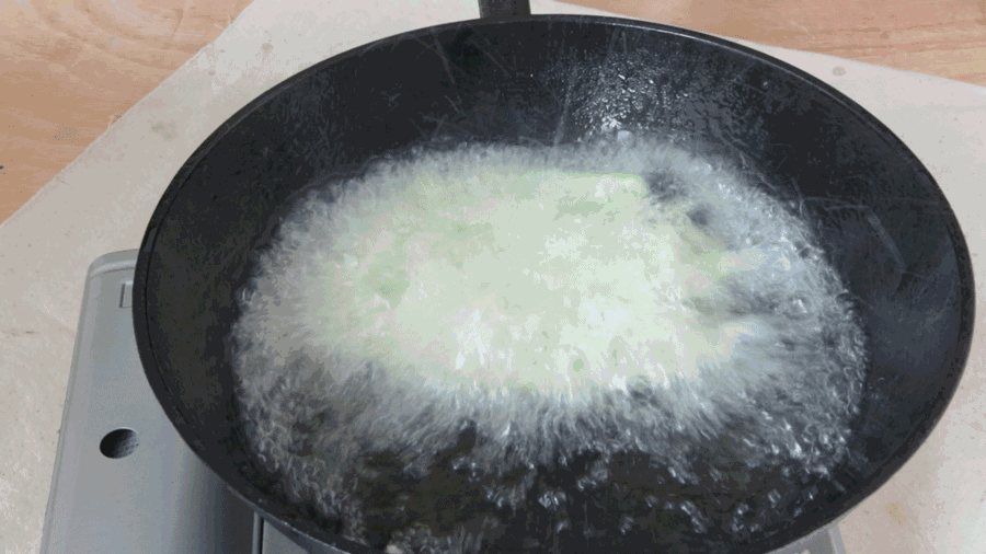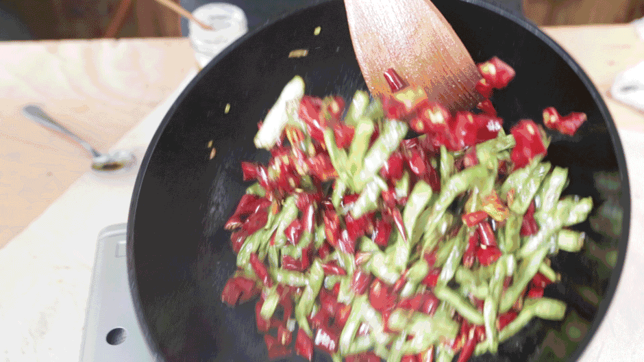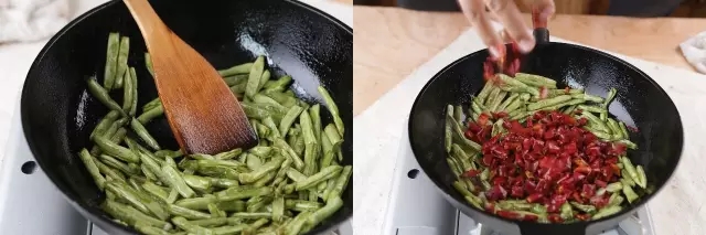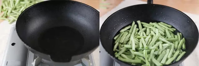 ③热锅起油,油温七分热时加入四季豆炸15分钟左右,保持大火,不断翻动,逼出四季豆的水分