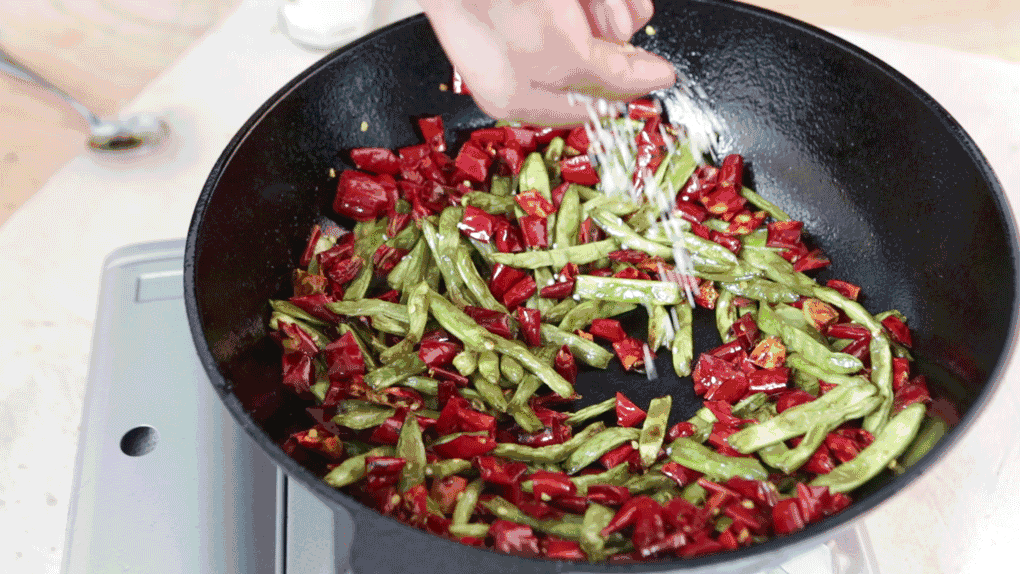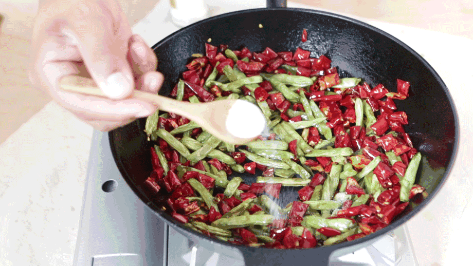 ⑤放入盐、生抽,慢慢煸至水汽散尽四季豆变得干酥