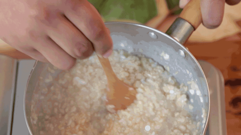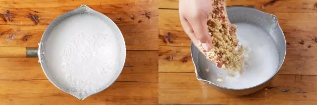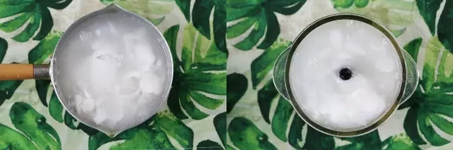 ④倒去泡糙米的水,捞出糙米和椰浆一起放入炖锅