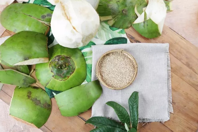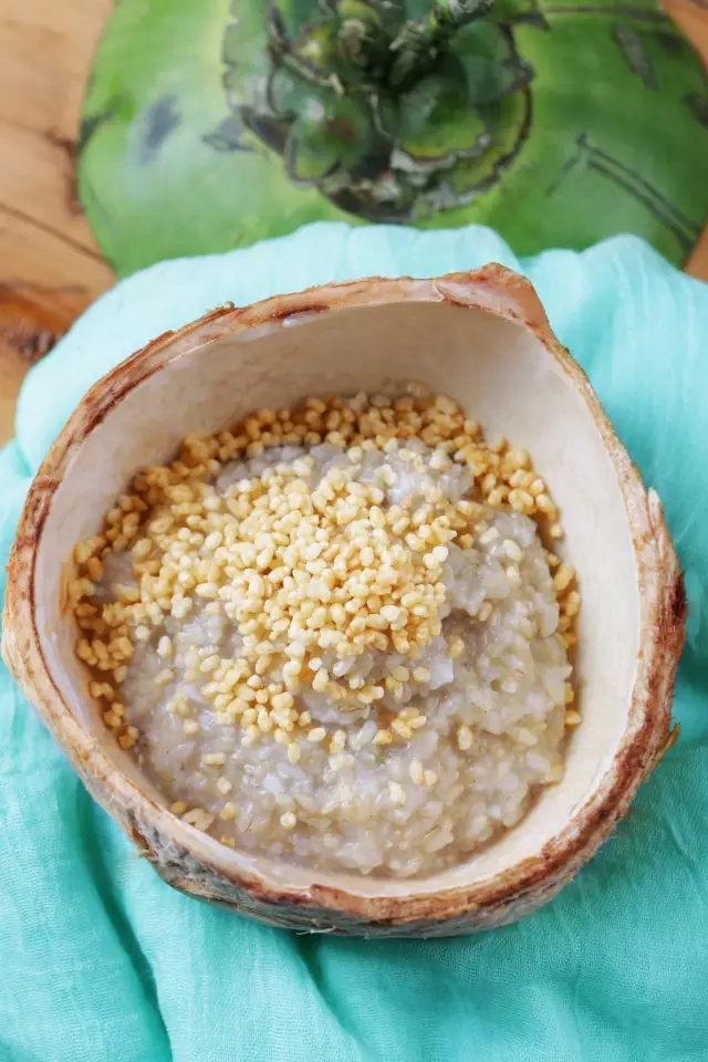 椰子削去厚厚的外壳,也可以在水果店买削好的。煮好的椰浆饭可以装入椰壳,能够锁住饭的椰香。