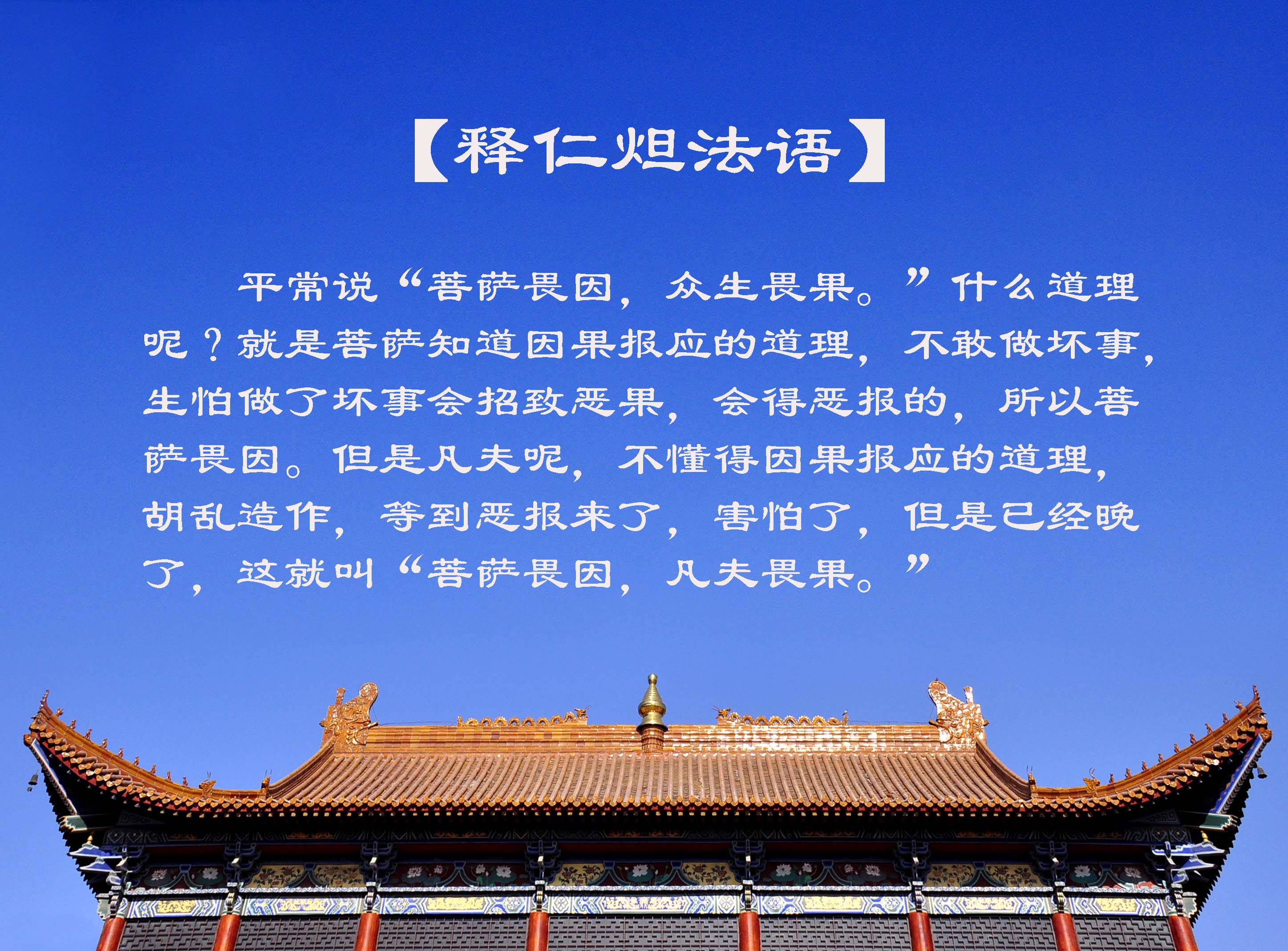 平常说“菩萨畏因,众生畏果。”什么道理呢,就是菩萨知道因果报应的道理,不敢做坏事,生怕做了坏事会招致恶果,会得恶报的,所以菩萨畏因。但是凡夫呢,不懂得因果报应的道理,胡乱造作,等到恶报来了,害怕了,但是已经晚了,这就叫“菩萨畏因,凡夫畏果。”