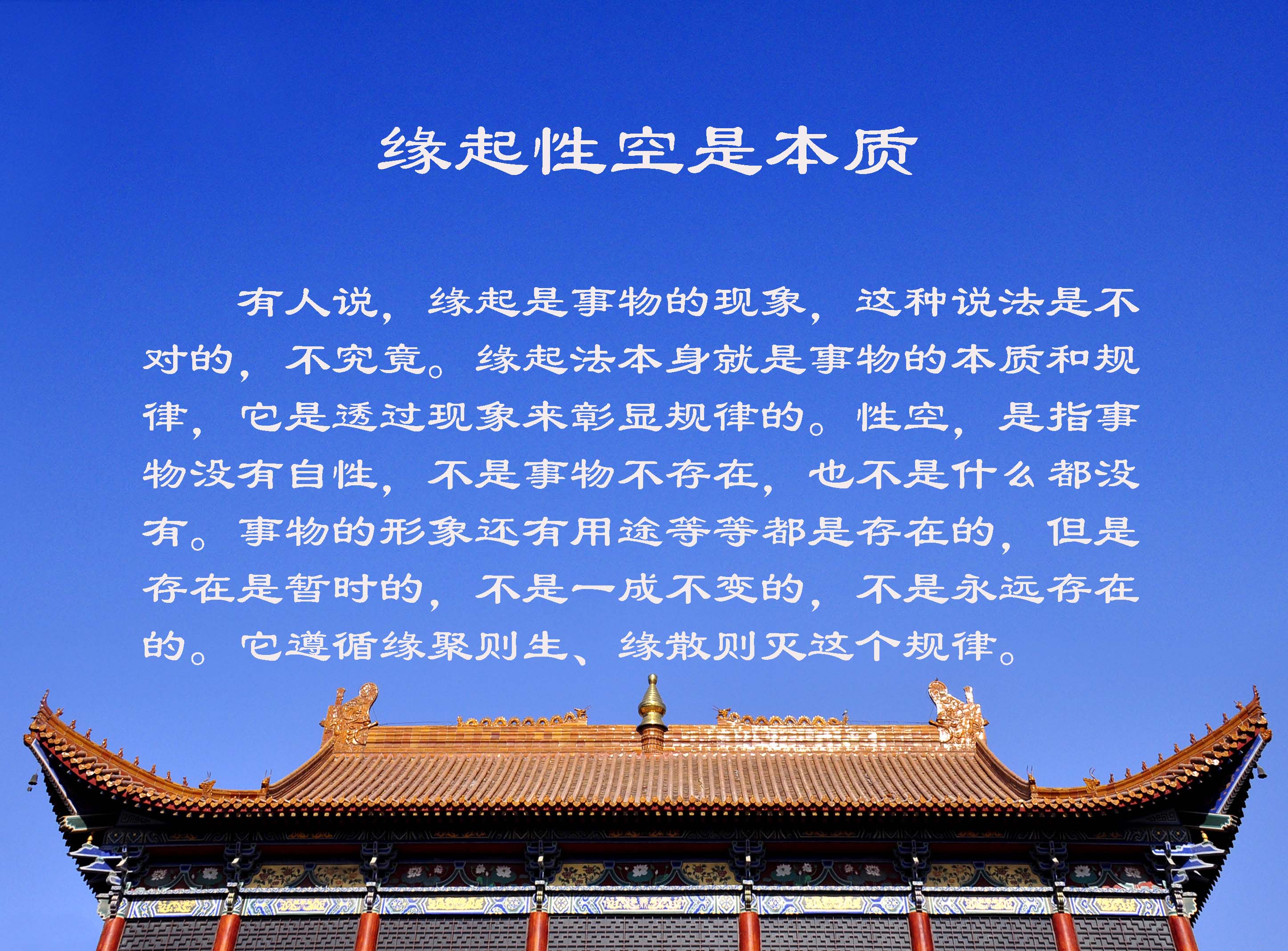 有人说,缘起是事物的现象,这种说法是不对的,不究竟。缘起法本身就是事物的本质和规律,它是透过现象来彰显规律的。性空,是指事物没有自性,不是事物不存在,也不是什么都没有。事物的形象还有用途等等都是存在的,但是存在是暂时的,不是一成不变的,不是永远存在的。它遵循缘聚则生、缘散则灭这个规律。