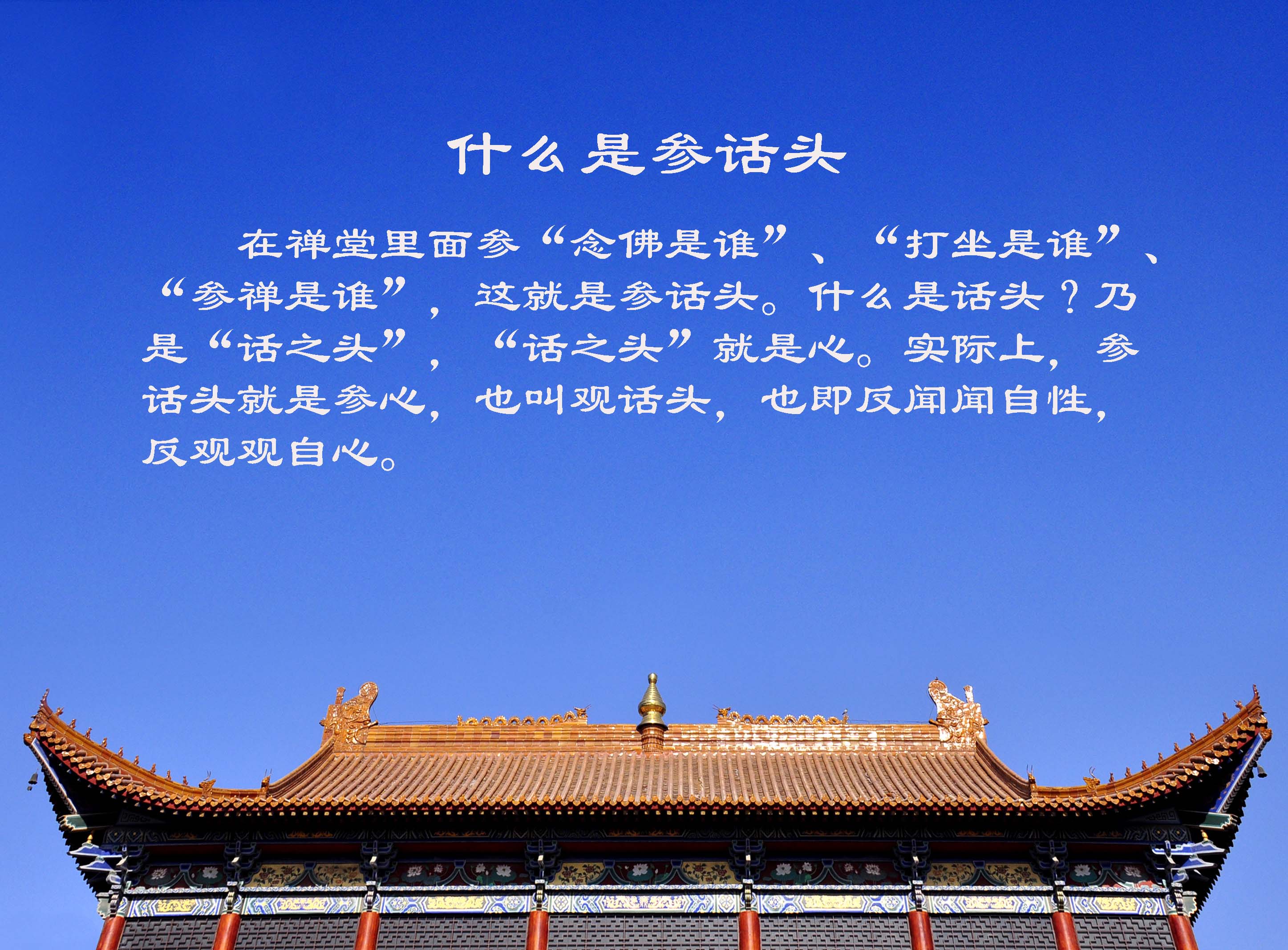 在禅堂里面参“念佛是谁”、“打坐是谁”、“参禅是谁”,这就是参话头。什么是话头?乃是“话之头”,“话之头”就是心。实际上,参话头就是参心,也叫观话头,也即反闻闻自性,反观观自心。