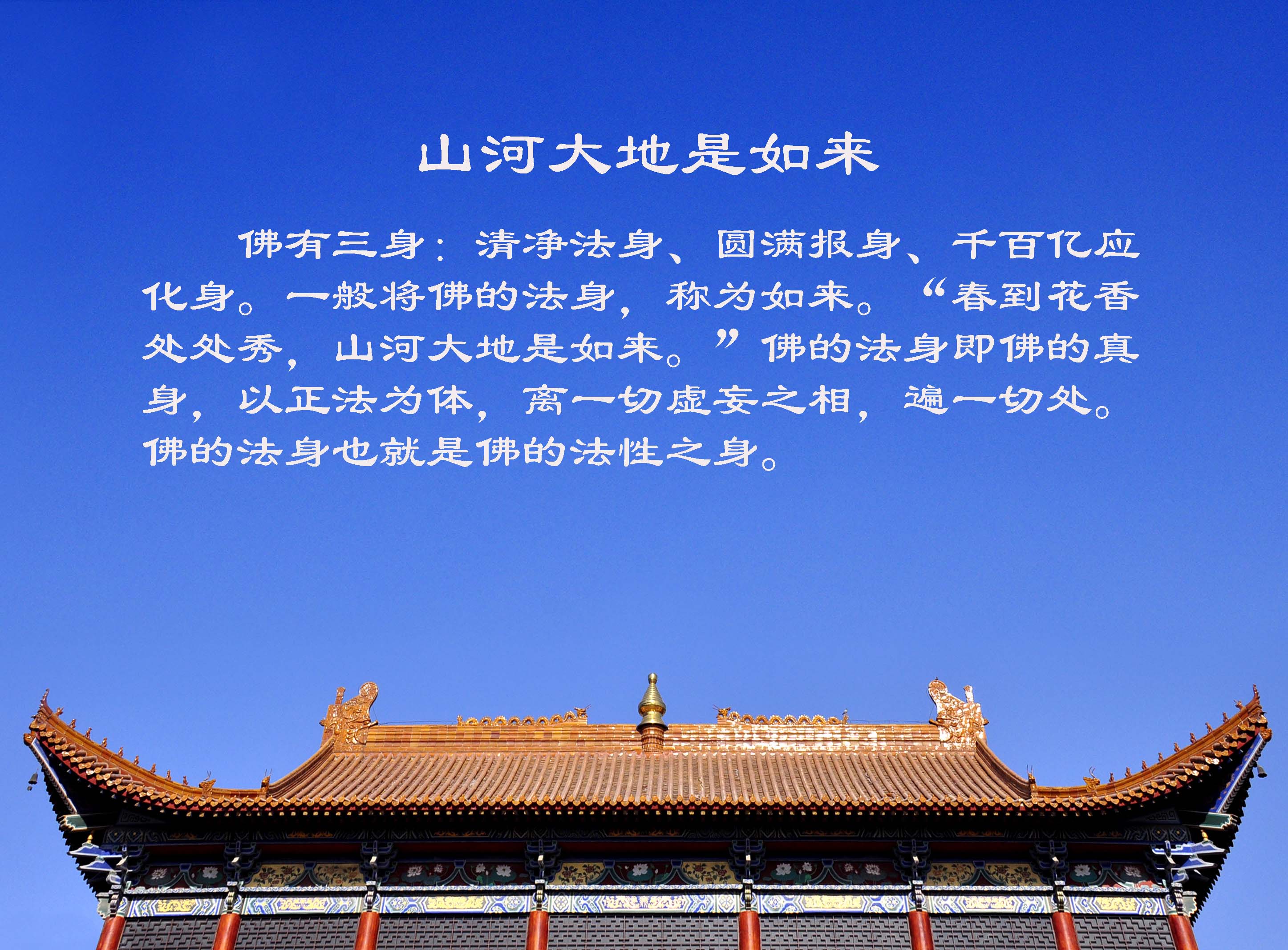 佛有三身:清净法身、圆满报身、千百亿应化身。一般将佛的法身,称为如来。“春到花香处处秀,山河大地是如来。”佛的法身即佛的真身,以正法为体,离一切虚妄之相,遍一切处。佛的法身也就是佛的法性之身。