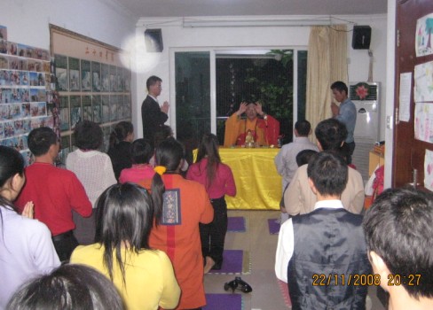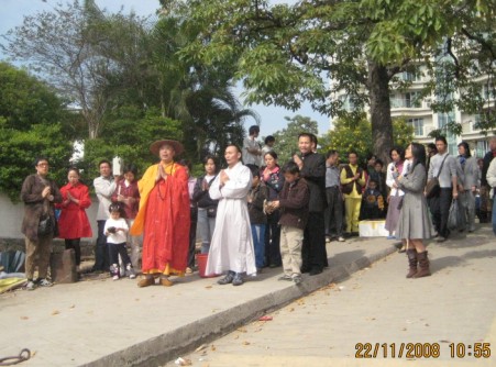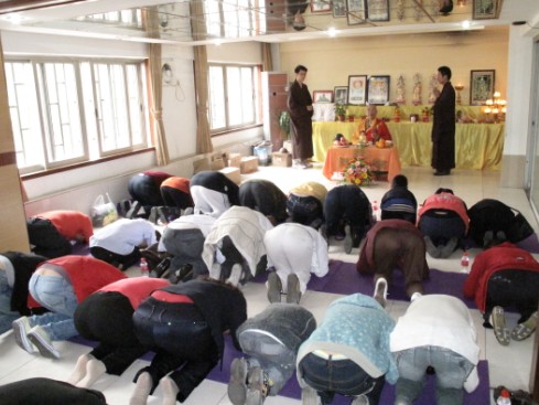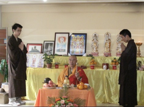 第二站我们到顺德,这一站是早已安排好的三皈五戒法会。顺德的妙山师兄一大早就来到番禺接我们一行,很快我们到了目的地顺德善缘素食馆,求授三皈五戒的信众已经早早在那里等候了。那天我很有福报,能够给师父作侍者。第一次穿海青,第一次给恩师当三皈五戒的侍者,荣幸之至,虽然有些地方做得不够如法,但看到这么多的人加入了佛门,这么多人开始持戒修行,心里也是法喜充满。
