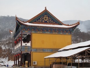 庄严的殿宇少不了彩绘的妆点,这也是古建筑的点睛之笔。正觉寺的古建不仅在建筑的风格形式上迈出了独到的一步,同时在彩绘的妆饰上也赋予了新意,体现了较高的审美标准。整个彩绘风格是按照宋明时期的风格绘制的,每个纹饰都象征着如意吉祥。特别是夹斗板上的莲花、牡丹纹饰,额枋上的如意纹饰和枋心威风凛凛的祥龙,都是祥瑞之义。整个万佛大雄宝殿内外的枋心彩绘和观音殿、文殊殿外部的枋心彩绘全是威龙。一方面是彰显各殿宇的雄魂壮魄,另一方面更是希望龙天护法能够保佑加持这个正法道场的顺利建成。除了纹饰以外,彩绘的整个色调以深蓝、深绿为主,浅蓝、浅绿、红、白、黑、金为辅。蓝色、绿色经过调和后进行使用,同时将瓦口、望板和大殿的柱子等部分的红色也都调成了暗红。整体降低了各个颜色本身的彩度和颜色与颜色之间的对比度,增强了色彩之间的联系,从而使整个色调协调、统一、避免了因颜色太纯、太鲜艳而使整个彩绘显得杂乱、浮躁有失庄重之感。浅蓝、浅绿的作用也很重要,不但加强了彩绘的层次感,而且与深蓝、深绿形成了同类色之间的渐变推移。勾黑是为了细致、规范图案的外形,勾黑基础上再进行最后一道工序勾白,是为了增强对比的同时提亮彩绘,使彩绘整体变得响亮,可谓是画龙点睛之功。金龙赫赫闪耀,与额枋如意纹饰里的金色点缀相呼应,在阳光的照耀下格外闪亮。再看看山花,深蓝的底色映衬着金灿灿的吉祥结,无论离寺院多远,都能映入眼帘,我想那更多的应该是心灵的召唤。博风板的绿色象征着寺院的繁荣昌盛,蒸蒸日上。驻足于美丽的彩绘,迎着春风听着“叮叮”清脆的铜铃声,我们能深深地感受到佛法这篇宏伟不朽的乐章的伟大。 佛教是庄严的,同时也是活泼的,就像仁炟法师为众生呈现的这座宝刹一样,雄魂与灵秀,沉静与热闹,都是那么自然而然。让我们心怀对诸佛菩萨的恭敬崇拜之情,对能行上人、仁炟法师的感恩之情,快乐地学佛,快乐地建寺,快乐地生活。人生像这彩绘一样,永不褪色!